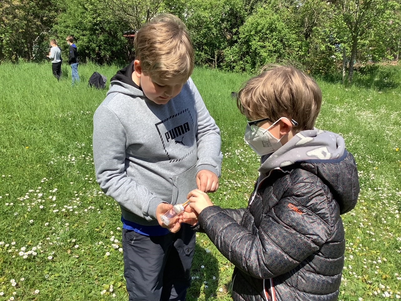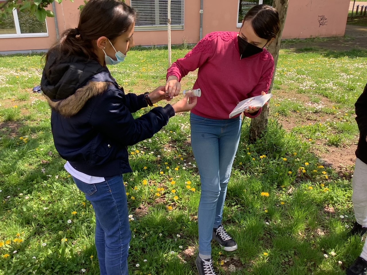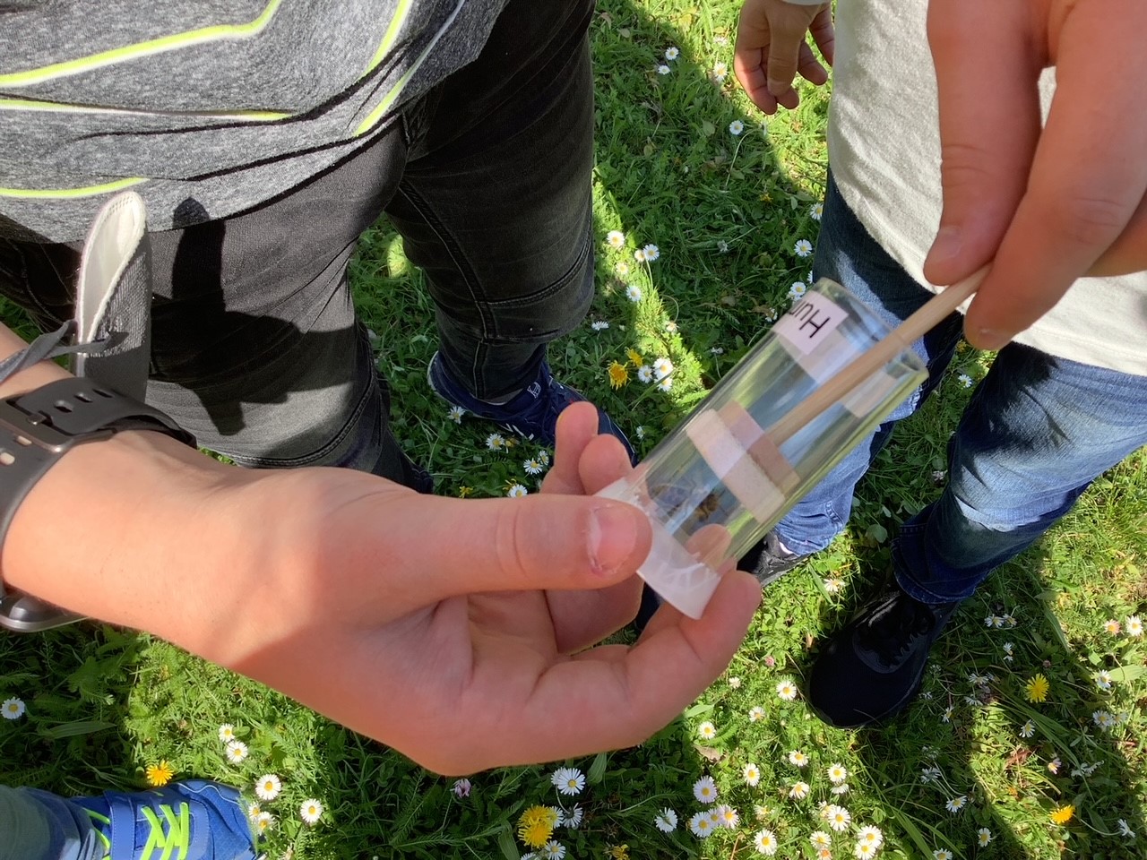 Die zwei Studentinnen „haben uns etwas über Hummeln erklärt, wie z.B. wir Hummeln und Bienen auseinander halten können. Dann haben wir Hummeln markiert, wir haben sie mit einer Röhre gefangen. Das Projekt war dafür da, zu schauen, wie viele Hummeln wir auf unserem Schulgelände haben.“ (Fay, 6a)