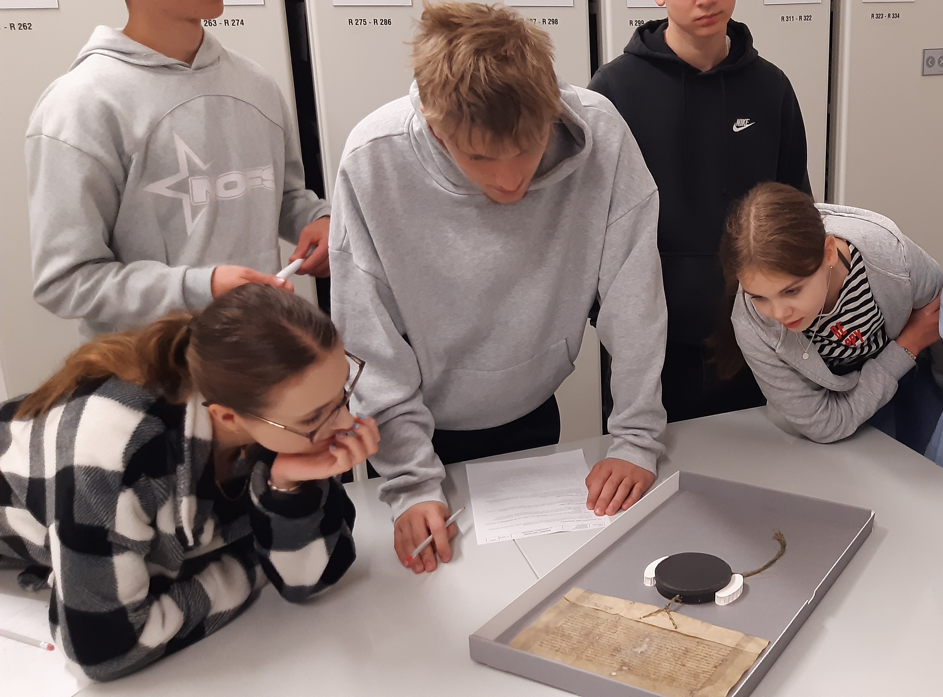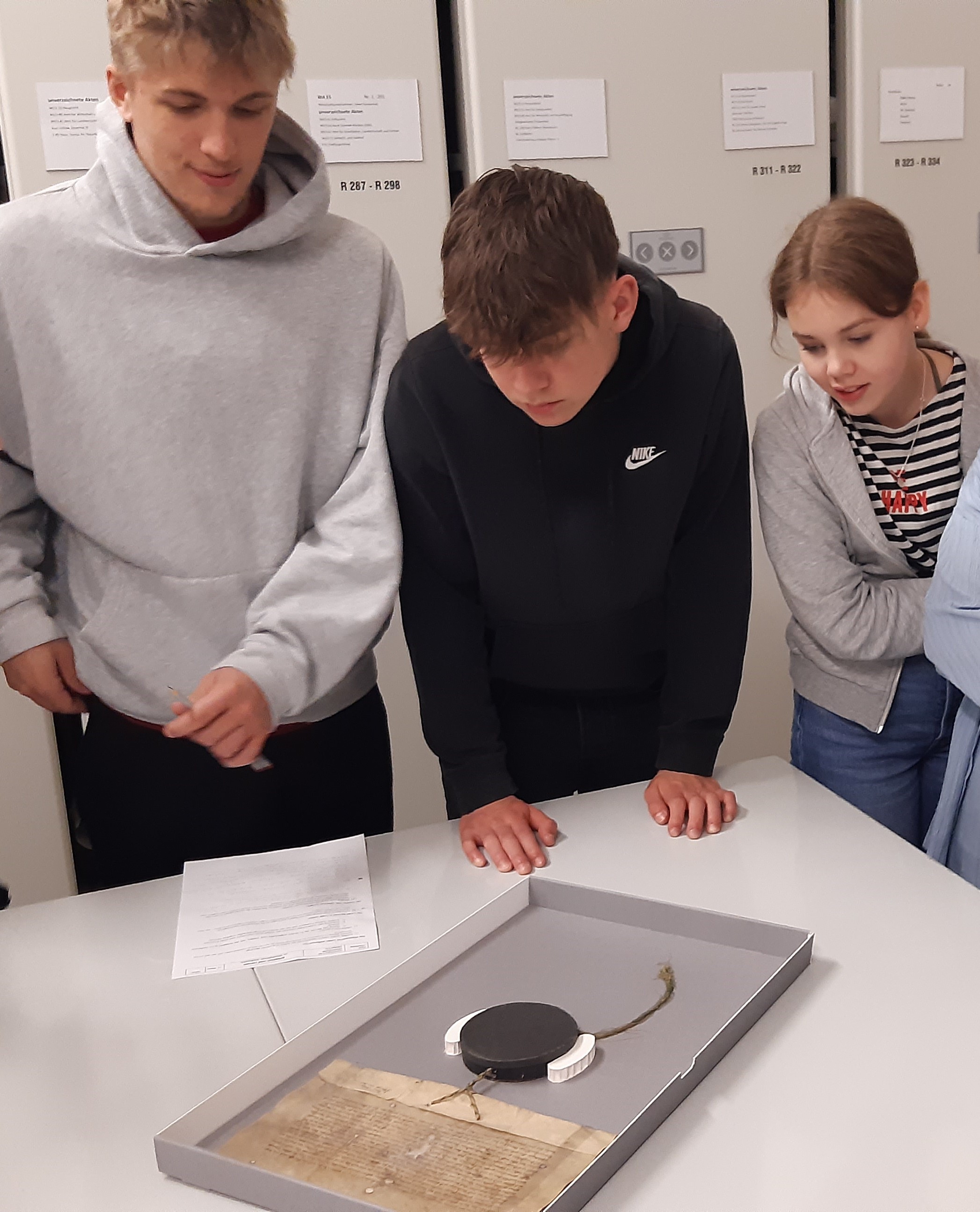 „Wandertag ins Wiesbadener Stadtarchiv“ – das klang für viele SchülerInnen der 10d im Vorfeld nicht gerade nach einem besonders interessanten Tag. Die Vorstellungen von Papierbergen, die in Schränken vermodern oder langweiligen Listen, die von alten Menschen sortiert werden, hat nicht gerade etwas Euphorisierendes. Umso erstaunter waren unsere Jugendlichen, als selbst ‚Geburtenregister‘ von 1905 mithilfe von Frau Dr. Lukat zum Erzählen gebracht wurden. Mindestens genauso eindrucksvoll wirkte die älteste Quelle des Stadtarchivs: Die originale Urkunde zur Verleihung der Stadtrechte an Sonnenberg von 1351. Niemand von uns hatte dieses so gut erhaltene Dokument auf ein solches Alter geschätzt. Mit ihrer motivierenden Art hat Frau Dr. Lukat uns glücklicherweise gezeigt, wie lebensnah und bedeutend das Gedächtnis Wiesbadens sein kann.
