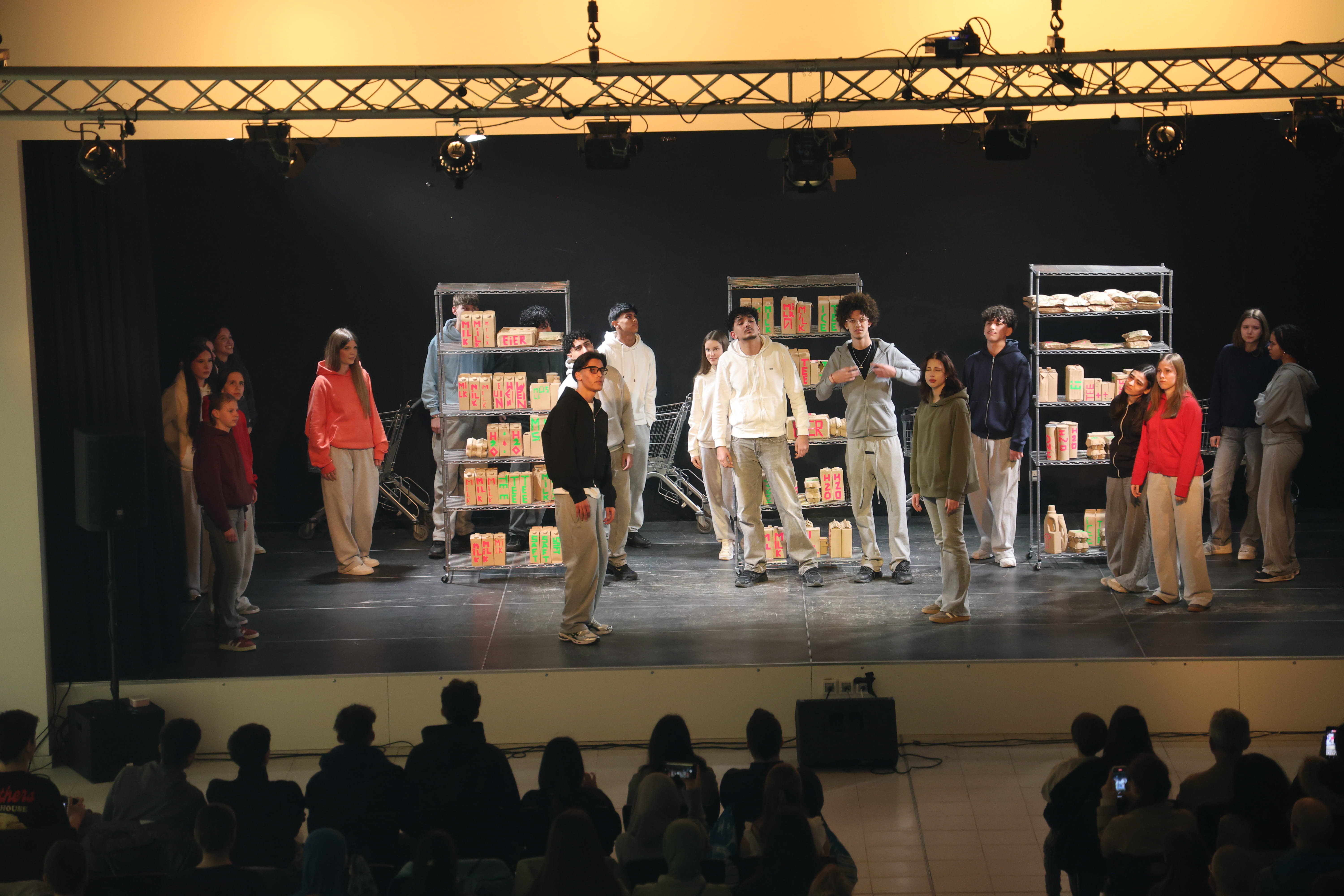In der Aula folgte anschließend ein abwechslungsreiches Bühnenprogramm. Für viel Begeisterung sorgte unter anderem der Trommelauftritt der 5b unter der Leitung von Frau Wenz, bevor Akrobatik und Theater die Aula einnahmen.